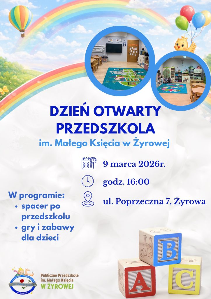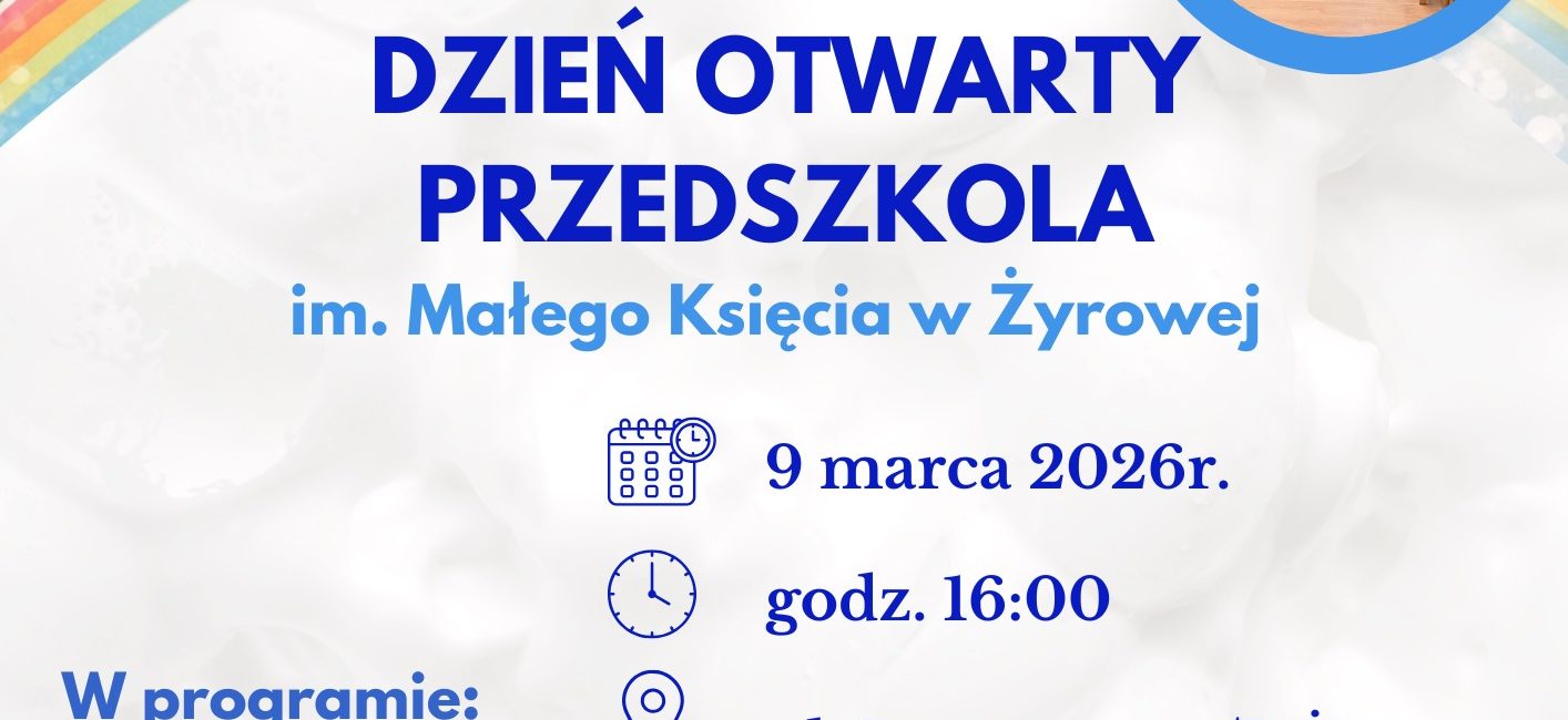 Publiczne Przedszkole im. Małego Księcia w Żyrowej zaprasza dzieci wraz z rodzicami na Dzień Otwarty, który odbędzie się 9 marca 2026 r. o godz. 16:00 w siedzibie przedszkola przy ul. Poprzecznej 7 w Żyrowej.