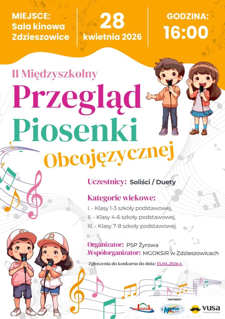 Dzisiaj (28 kwietnia 2026 roku) zapraszamy wszystkich mieszkańców do sali kinowej w Zdzieszowicach gdzie odbędzie się II Międzyszkolny Przegląd Piosenki Obcojęzycznej organizowany przez naszą Szkołę Podstawową. Wydarzenie rozpocznie się o godzinie 16:00 i skierowane jest do uczniów szkół podstawowych.