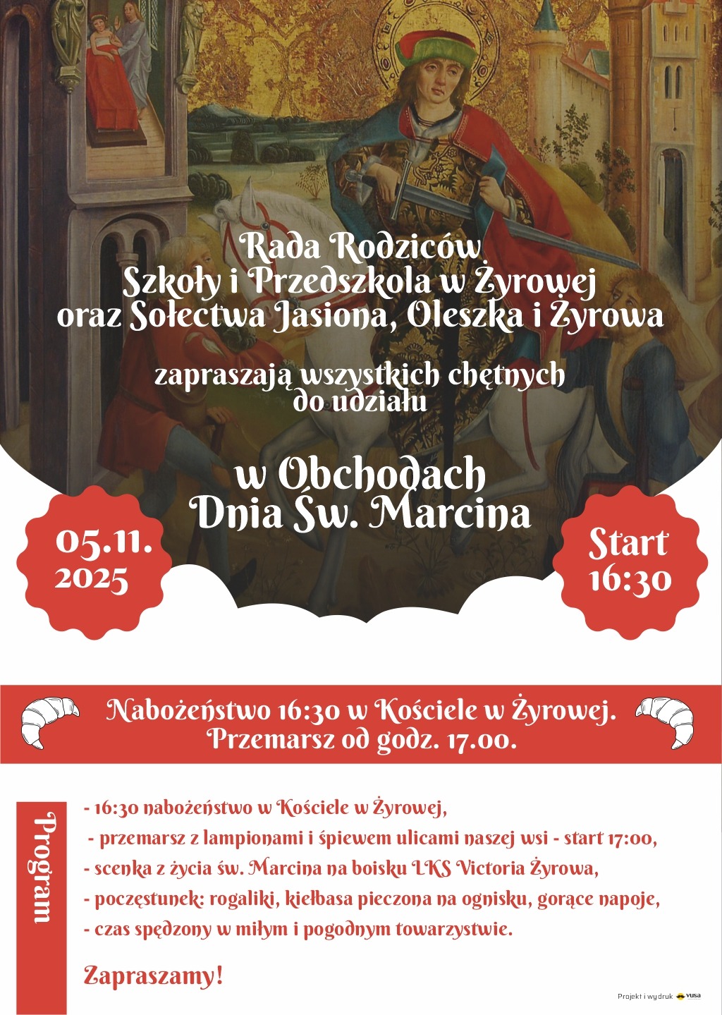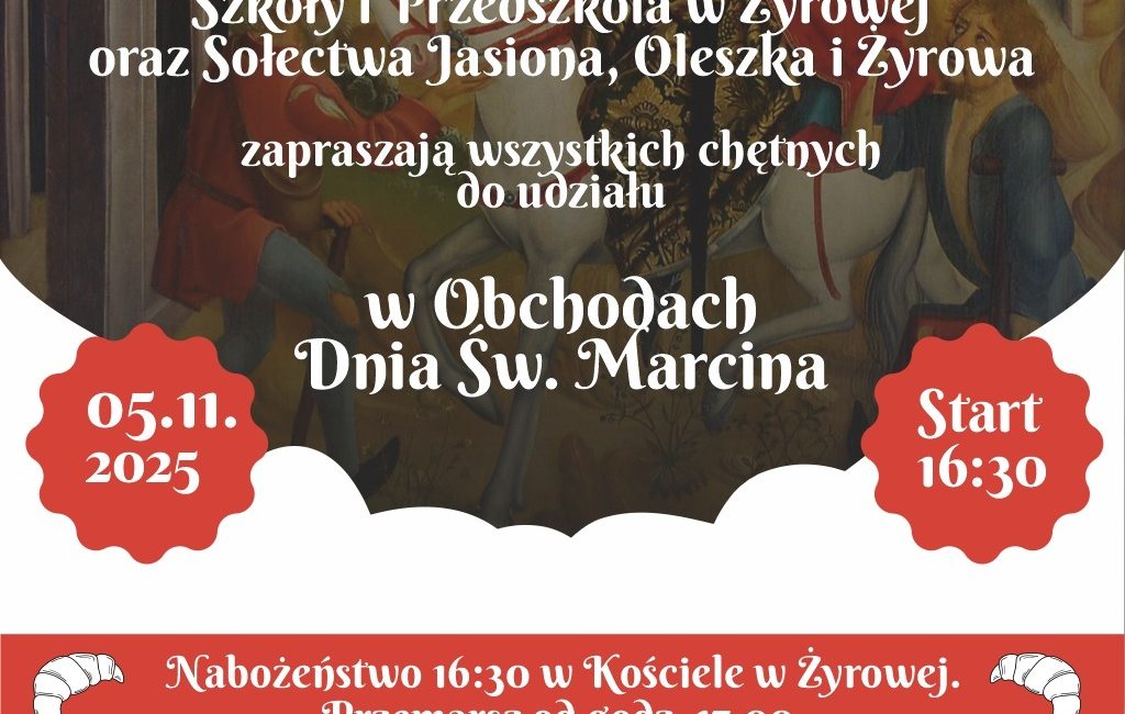 W środę, 5 listopada 2025 roku, w Żyrowej odbędą się coroczne obchody Dnia św. Marcina, organizowane przez Radę Rodziców Szkoły i Przedszkola w Żyrowej przy współpracy z Sołectwami Żyrowa, Oleszka i Jasiona.
