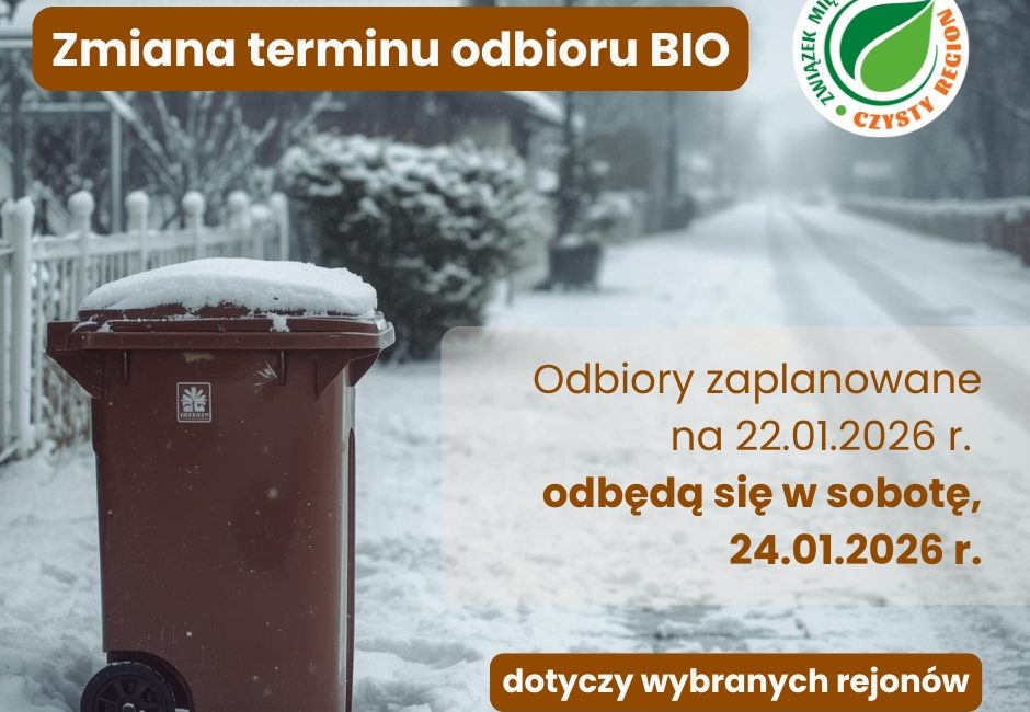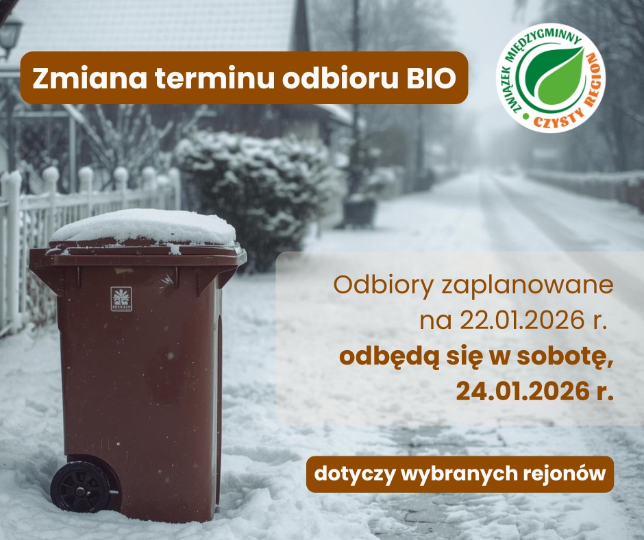 Zgodnie z najnowszym komunikatem Związku Międzygminnego „Czysty Region”, odbiór odpadów BIO w miejscowościach objętych pierwotnym harmonogramem na 22 stycznia 2026 r. zostanie przesunięty na sobotę, 24 stycznia 2026 r.